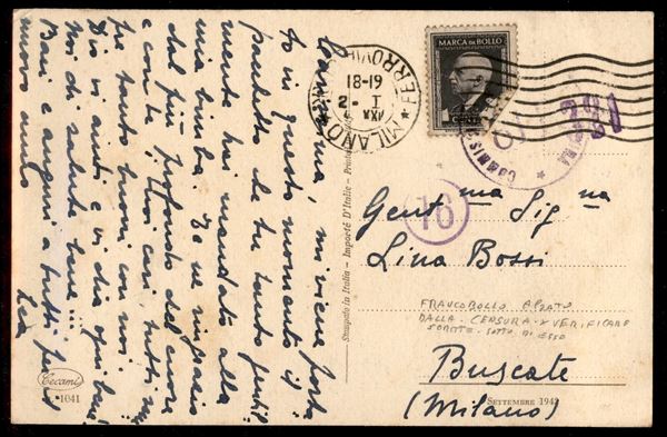 30 cent Marca da Bollo effigie in rettangolo su cartolina da Milano del 2.1.4... per Buscate - francobollo sollevato dalla censura - interessante il bollo datario con le scritte capovolte