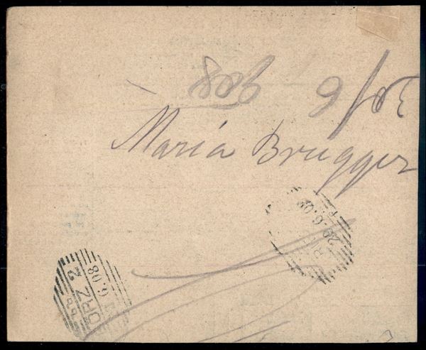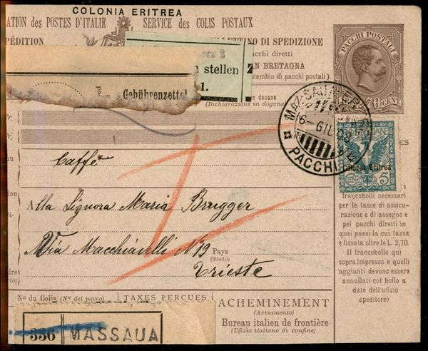 5 cent Soprastampato (21) complementare su frammento di Bollettino Pacchi da 2,70 lire (P4) da Massaua a Trieste del 6.6.08
