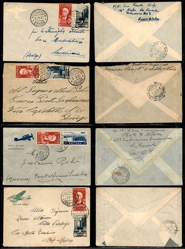 Addis Abeba - quattro aereogrammi per l'Italia dal febbraio all'aprile 1937 (5 Etiopia + 209 Eritrea)