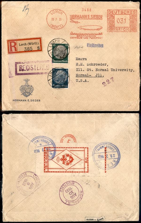 Aerogramma raccomandata da Lorch per gli U.S.A. del 29.7.33 con affrancatura mista meccanico/valori (514 + 525)