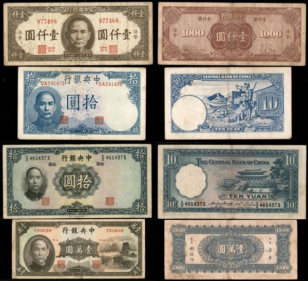BACONOTE - 1936 (10 yuan) + 1942 (10 yuan) + 1945 (1000 yuan) + 1947 (10000 yuan) - insieme di 4 banconote circolate