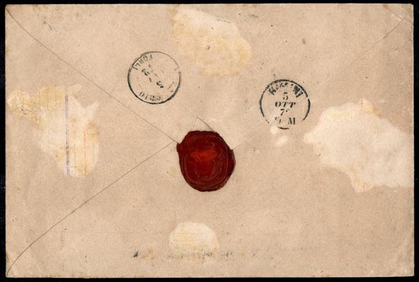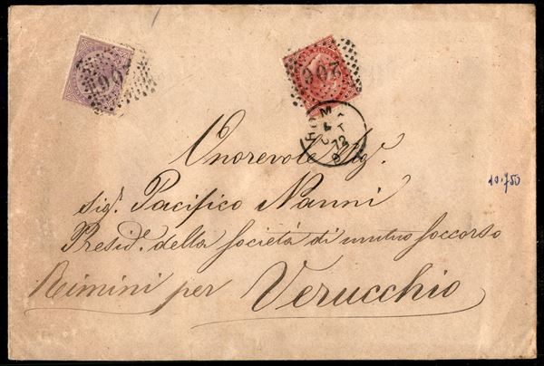 Busta cinque porti da Roma a Verucchio del 4 ott. 72 affrancata con 50 cent + 60 cent (20 + 21) - non comune porto multiplo