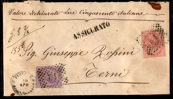 Bustina assicurata lire cinquecento gr. 8 e 3/4 affrancata con 40 cent + 60 cent (20 + 21) - da firenze per Terni del 20 apr. ...