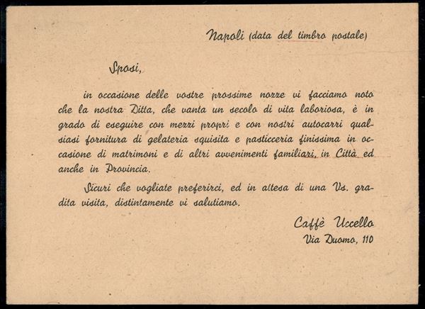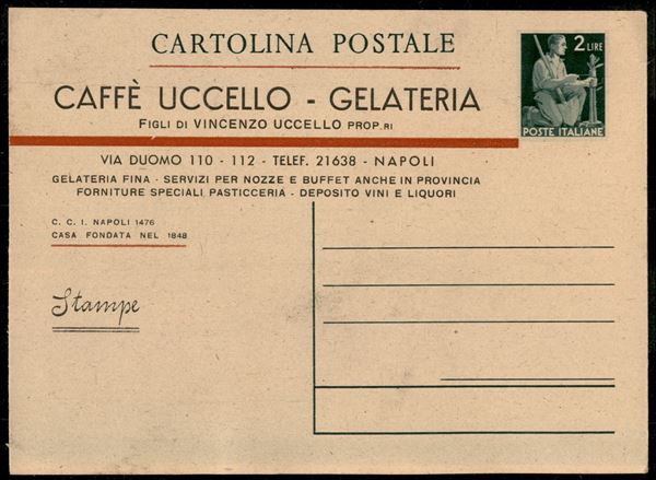 Cartolina Postale Democratica 2 lire (C130) nuova con stampa pubblicitaria Caffè Uccello Gelateria di Napoli