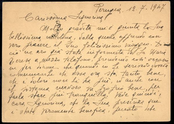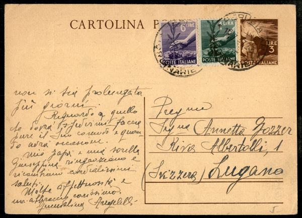Cartolina Postale Fiaccola 3 lire (C131) affrancata con Democratica 1 lira + 6 lire da Perugia 16.7.47 per la Svizzera