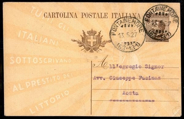 Cartolina Postale Prestito del Littorio 40 cent (C64) da Fontainemore 13.5.27 per Aosta - pieghina d'angolo