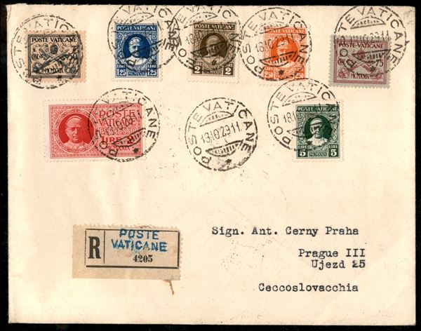 Conciliazione sei valori + 2 lire Espresso (6/7 + 9/12 + Espressi 1) su raccomandata del 18.10.29 per la Cecoslovacchia