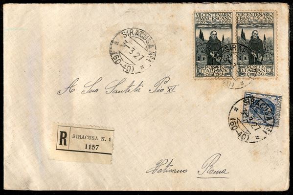 Coppia 30 cent dent. 11 + 1,25 lire (198 + 202) su busta raccomandata diretta a Sua Santità Papa Pio XI da Siracusa N. 1°