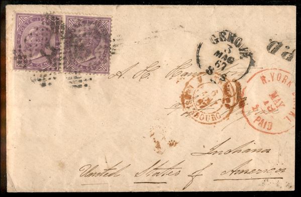 Coppia 60 cent (21) su bustina da Genova per gli USA del 3 mag. 67