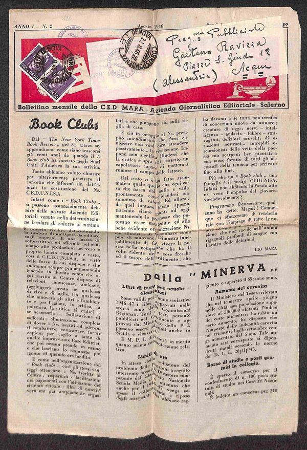 Coppia del 50 cent Turrita (538) annullata a Genova il 27.8.46 su giornale completo per Acqui - rara