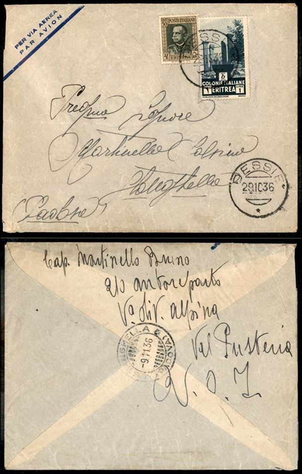 Dessič (P.ti 8) - aereogramma per Padova del 29.10.36 (199 + 209 Eritrea)