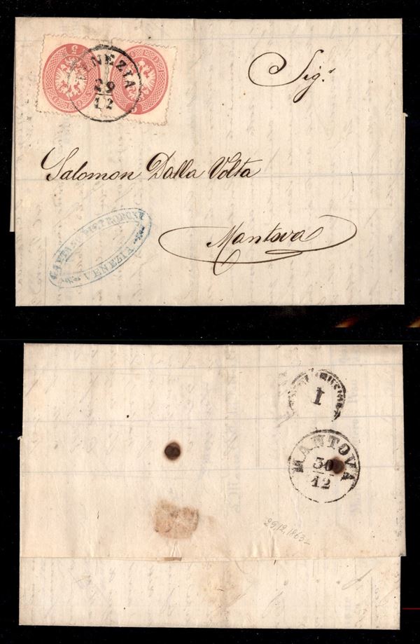 Due 5 soldi (38) applicati a tete beche su lettera da Venezia a Mantova del 29.12.63 (300+)