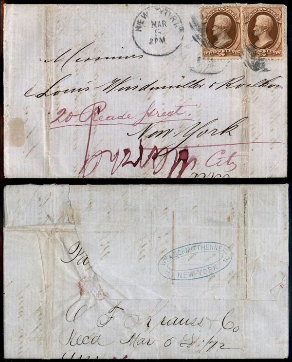 Forwarded - Due 2 cent (37) apposti in arrivo su lettera da Parigi a New York del 17.2.72 via Liverpool - pezzo di destra difettoso