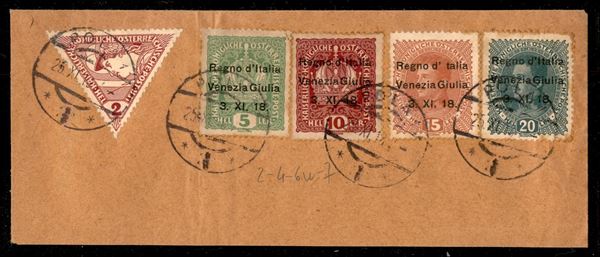 Frammento di busta con affrancatura per 55 heller (2 + 4 + 6u + 7) con 15 heller varietà talia - Pola 25.11.18