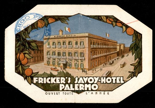 Fricker's Savoy-Hotel Palermo - Maggio 1933 tariffario informativo al retro in inglese - piega verticale al centro