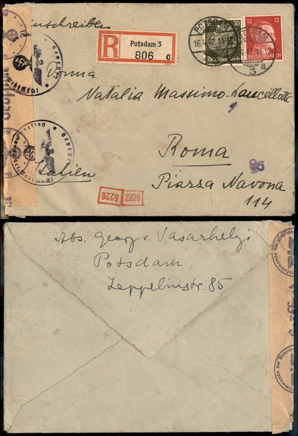 Hindemburg (523) + Hitler (788) - raccomandata da Potsdam a Roma del 16.4.42 - censure