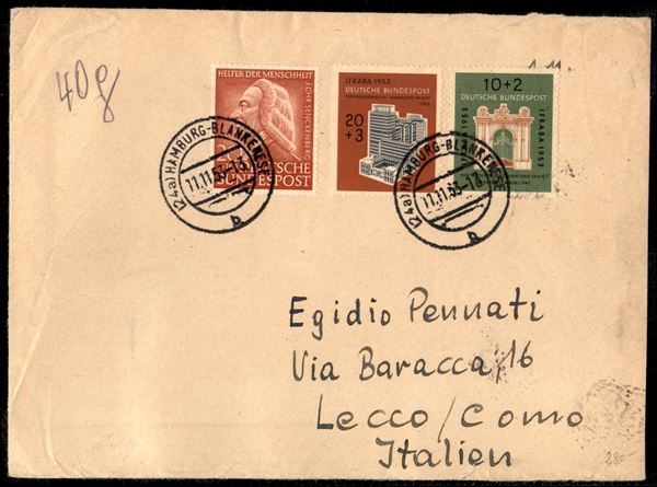 IFRABA 1953 (171/172) + 20 + 10 pfenning (175) - busta da Hamburg Blankenese a Lecco del 11.11.53