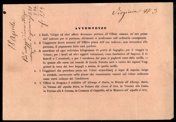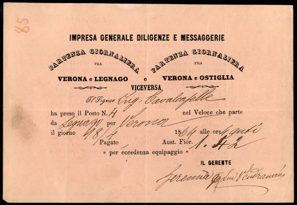 Impresa Generale Diligenze e Messaggerie - biglietto di viaggio da Legnago a Verona del 18.4.64