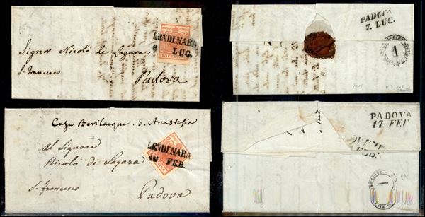 Lendinara (P.ti 6) - due letterine d'archivio per Padova del 1851 (16/2 - 6/7) col 15 cent (3) appena corto da un lato (1.120)