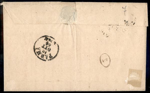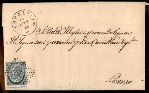 Lettera con 20/15 cent I tipo (23) con annullo numerale 926 da Corniglio 17 ott. 66 a Parma