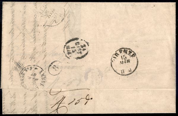 Lettera con coppia 20/15 cent II tipo (24) con annullo numerale 14 da Livorno 14 mar. 67 a Firenze