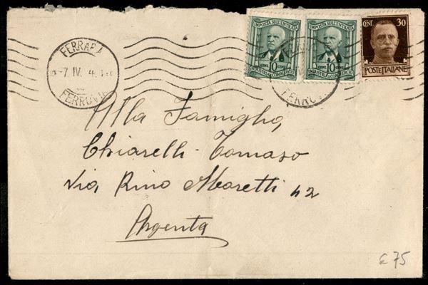 Lettera da Ferrara 7.IV.34 per Argenta affrancata con 30 cent Imperiale + due 10 cent Marca da Bollo Industria e Commercio - in tariffa 50 centesimi - non tassata