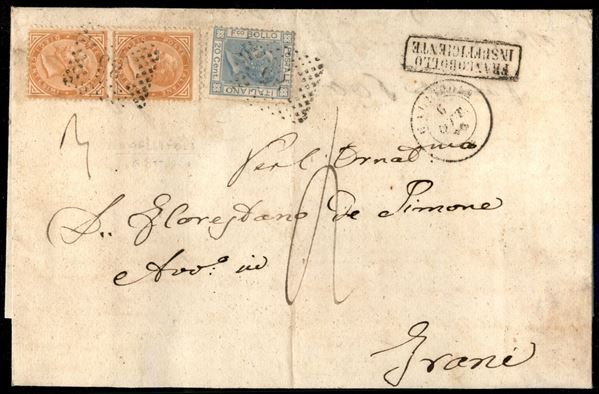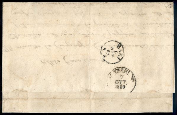 Lettera tre porti da Gallipoli 6 ott. 69 per Trani affrancata con coppia verticale 10 cent + 20 cent (17 + 26) - segno di tassa e bollo Francobollo Insufficiente