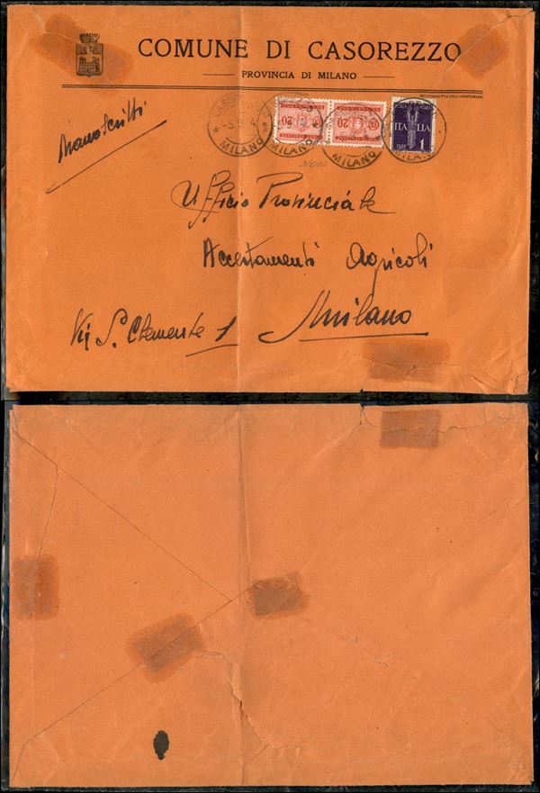 Manoscritti da Casorezzo a Milano del 5.9.44 con affrancatura d'emergenza (Aerea 14 + Segnatasse 36 coppia) - Savarese