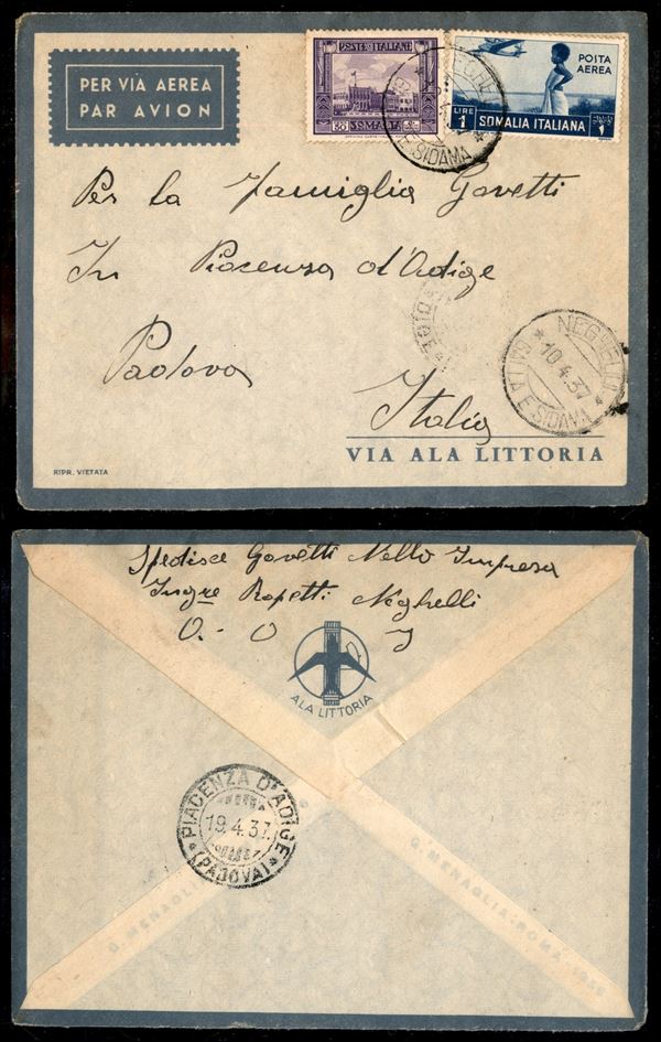 Neghelli Galla e Sidana (P.ti 10) - aerogramma per Padova con affrancatura di Somalia (221 + 21 Aerea)