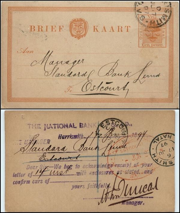 Oraje Staat - Intero postale 1 penny da Harrismith a Estcourt del 17.6.97 - rotto nel disegno