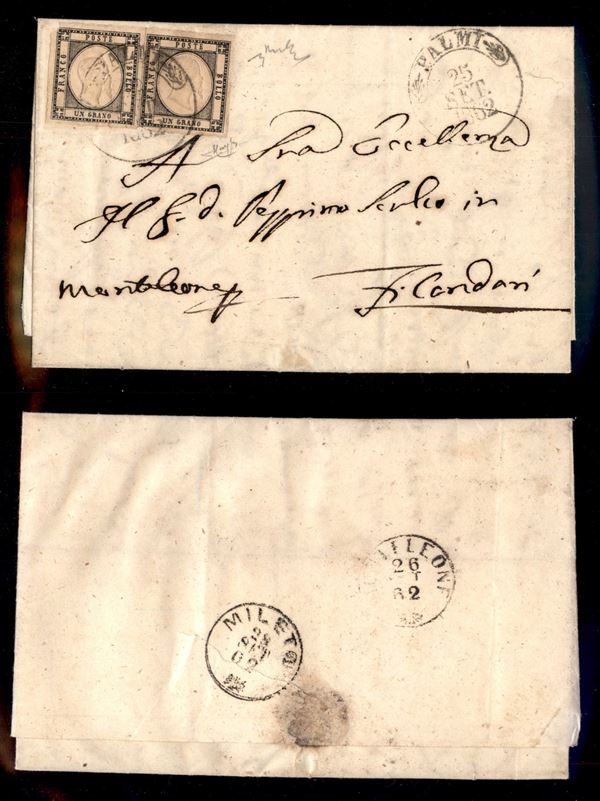 Palmi (P.ti 4) - due pezzi del 1 grano (19) su lettera per Monteleone del 25.9.62 - pezzo di sinistra difettoso nell’angolo superiore sinistro - Chiavarello + Raybaudi
