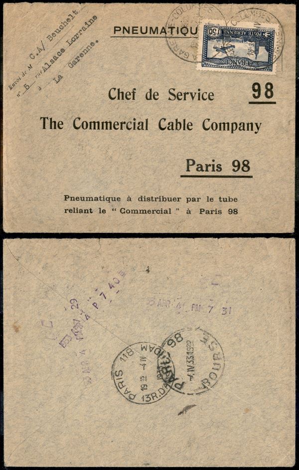 Posta Pneumatica - 1,50 franchi (255) su busta da La Garenne (Columbes Seine) a Parigi del 4.4.33