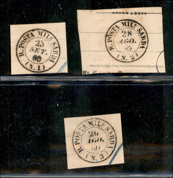 R, Posta Militare Sarda (N.1 + N.2 + N.3 - 1860) - insieme di tre impronte su frammenti