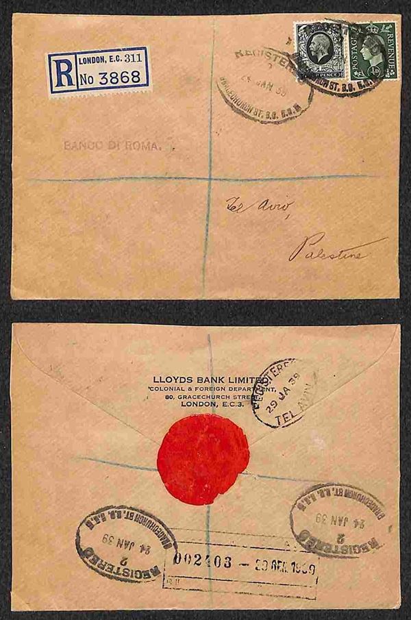 Raccomandata affrancata per 5,5 pence (181 + 198) da Londra a Tel Aviv del 24.1.39
