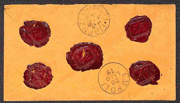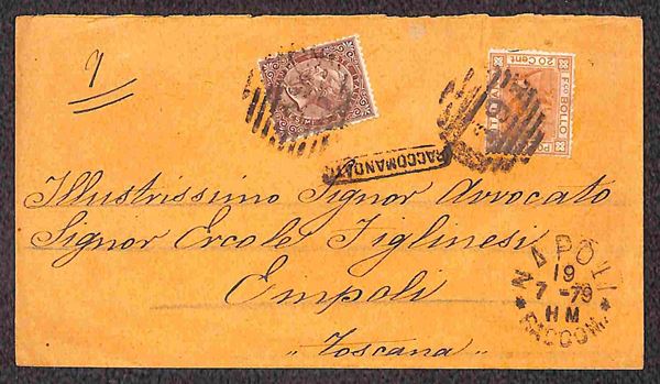 Raccomandata con 30 cent + 20 cent (19 + 28) con annullo numerale a sbarre 19 da Napoli 19.7.79 per Empoli