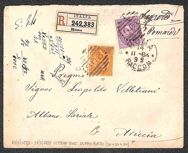Raccomandata due porti con 20 cent + 50 cent (39 + 42) da Roma 14.11.84 per Ariccia