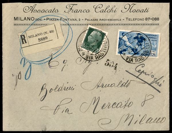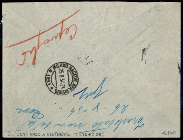 Raccomandata in distretto con Imperiale 25 cent + Calcio 1,25 lire (248 + 360) da Milano 25.8.34 per cittą