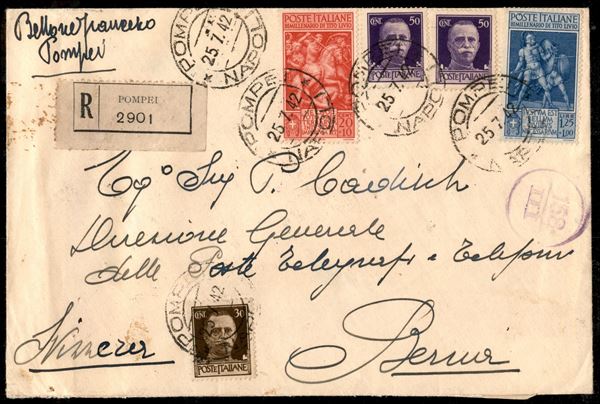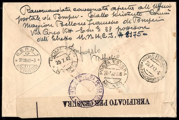 Raccomandata per la Svizzera con Imperiale due 50 cent + Tito Livio 20 cent + 1,25 lire (251 + 458 + 461) da Pompei 25.7.42 a Berna