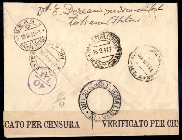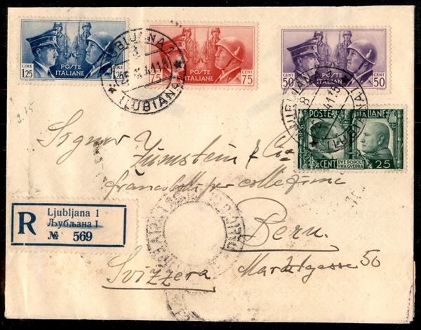 Raccomandata per la Svizzera da Lubiana 25 sett. 1941 con affrancatura quattro colori Hitler e Mussolini (Regno 454/57)