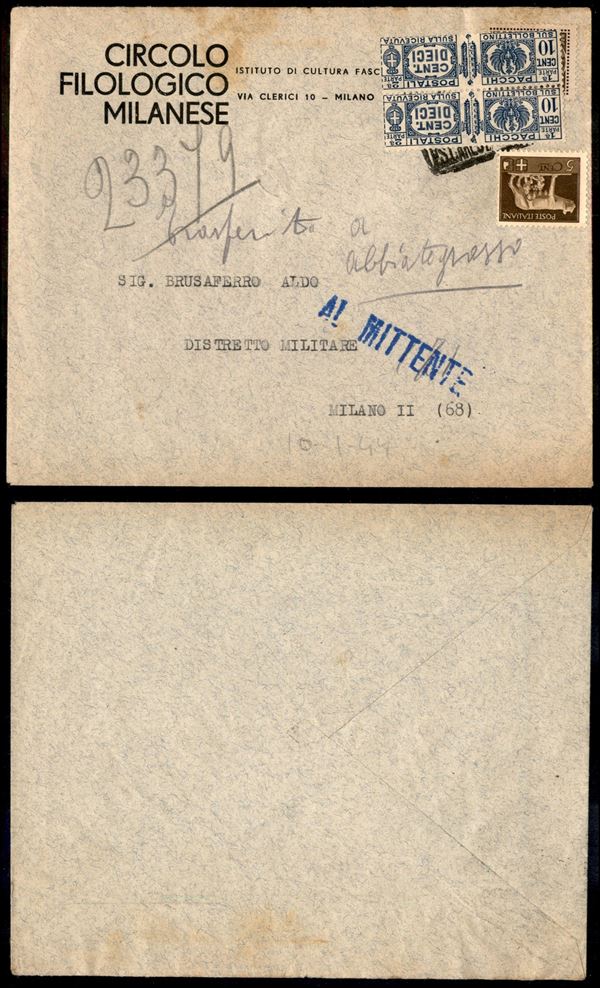 Recapito Autorizzato - busta per cittą (Milano 10.1.44) col 10 cent (3) rispedita al mittente con affrancatura d'emergenza (243 + Pacchi 25 coppia) non obliterata