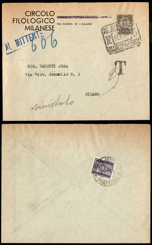 Recapito Autorizzato - busta per cittą (Milano 26/27.11.43) col 10 cent (3) rispedita al mittente tassata con 50 cent Segnatasse (40) al retro