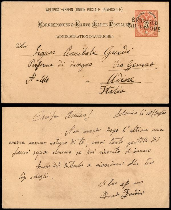 Sebenico col Vapore - cartolina postale da 5 kreuzer per Udine del 18.7.(1888)