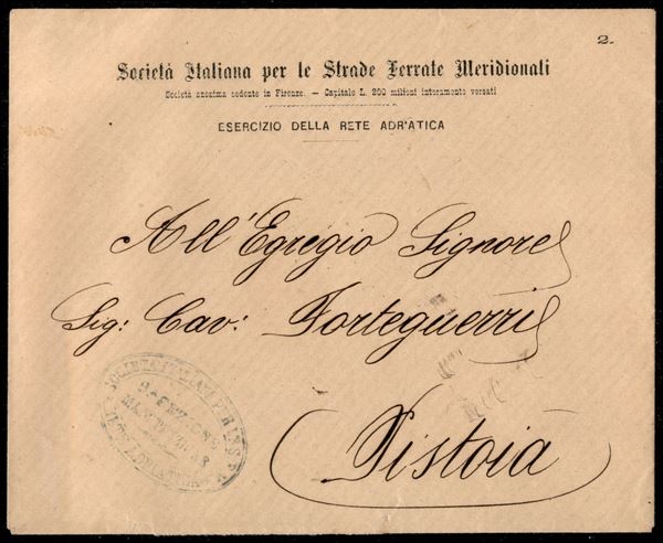 Società Italiana per le S.F.M./Rete Adriatica (in verde) - busta in franchigia per Pistoia
