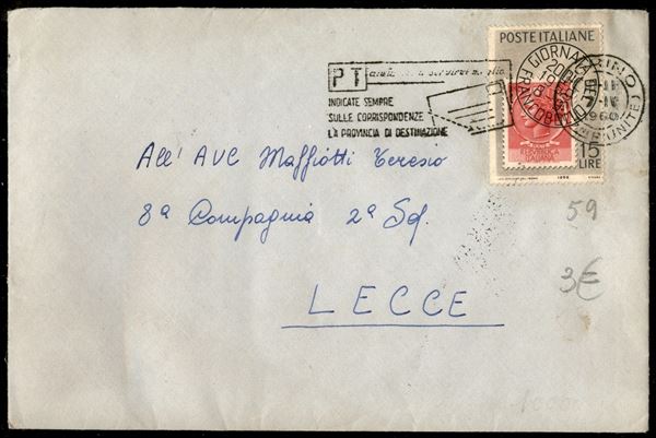 Tariffa ridotta a militare - 15 lire I Giornata del Francobollo (879) su lettera da Torino per Lecce del 7.4.60