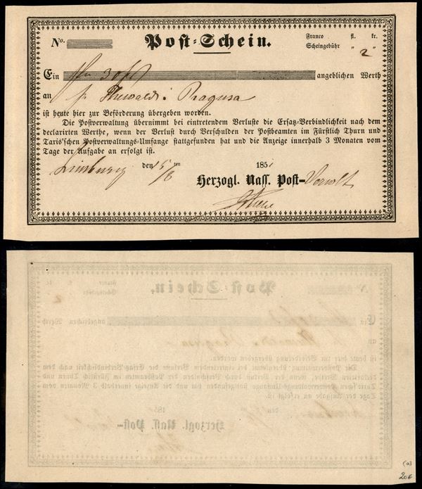 Thurn & Taxis - Post Schein per 30 scellini da Limburg a Ragusa del 15.8.51
