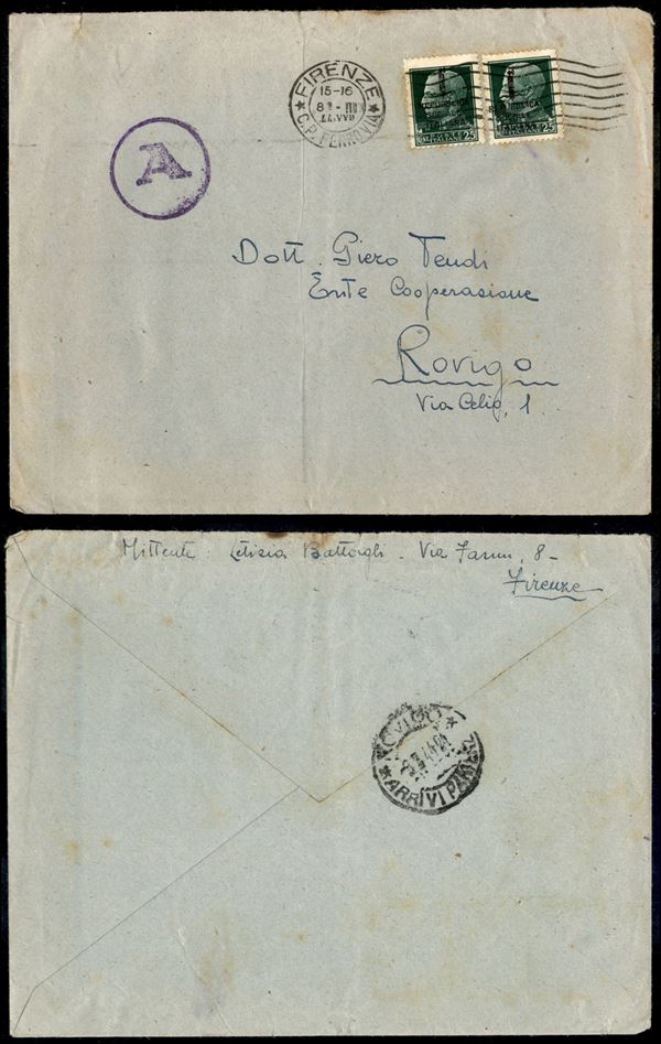 Tiratura di Firenze - 25 cent (491) + 25 cent (491pmf) con soprastampa a sinistra - busta per Rovigo del 8.3.44