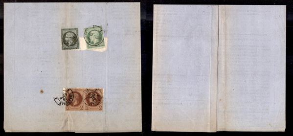 Tricolore mista (3 emisssioni) - 1 cent (10) + 5 cent (19) + coppia del 2 cent (25) - circolare sotto fascia (asportata) da Marsiglia del 29.9.63 - due valori piegati a cavallo del bordo - da esaminare
