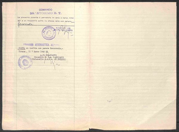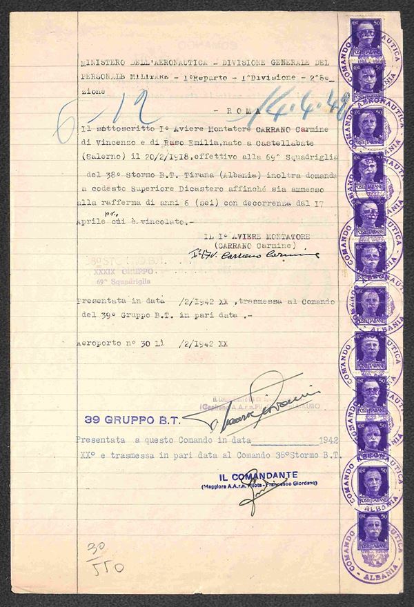 Uso fiscale - Comando Aeronautica/Albania - dodici pezzi del 50 cent Imperiale (251 - Regno) su documento di richiesta del prolungamento di Servizio del 14.4.42 - da esaminare