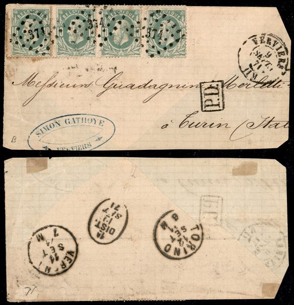 10 cent (27) - striscia orizzontale di 4 su parte di lettera da Verviers a Torino del 9.9.71