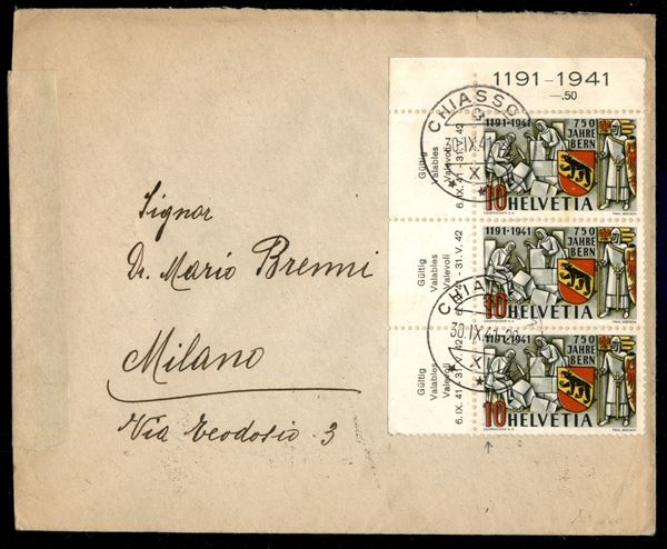 10 cent 750° Berna (398) - striscia verticale di tre angolo di foglio su busta da Chiasso a Milano del 30.9.1941 - censure